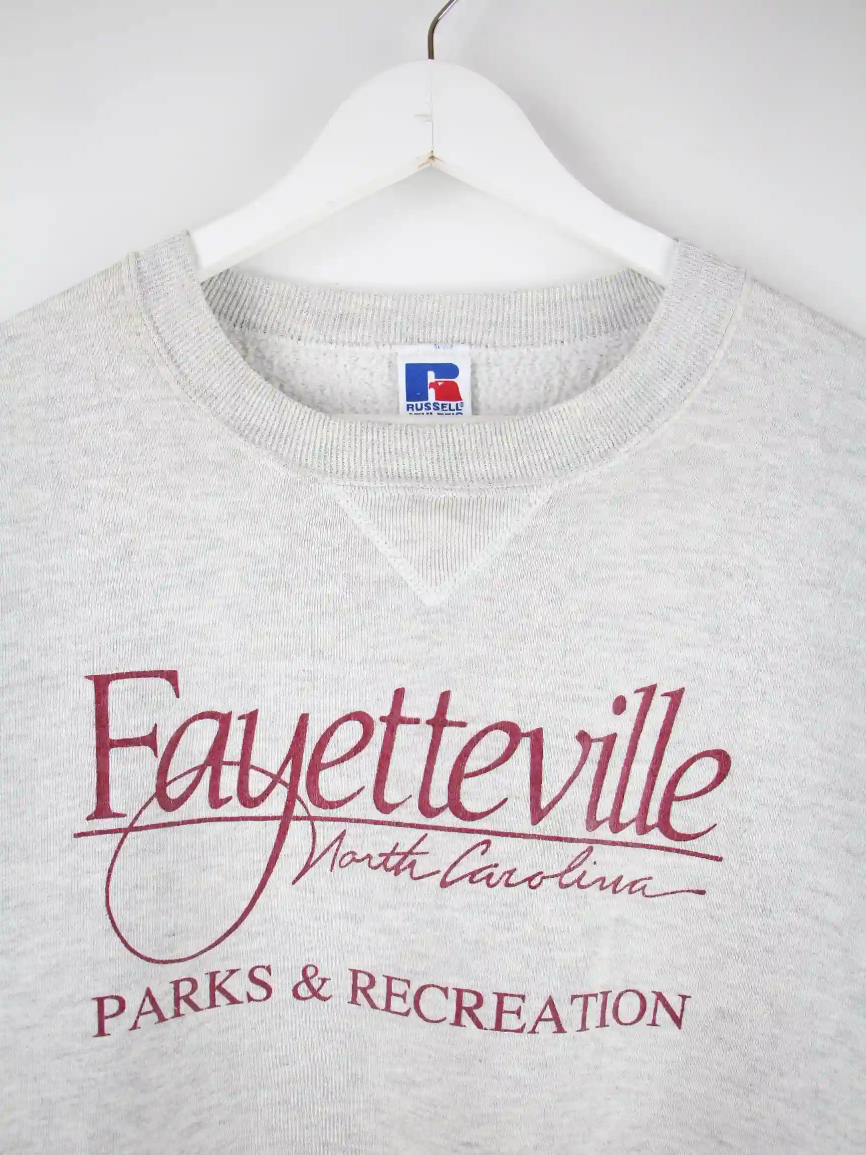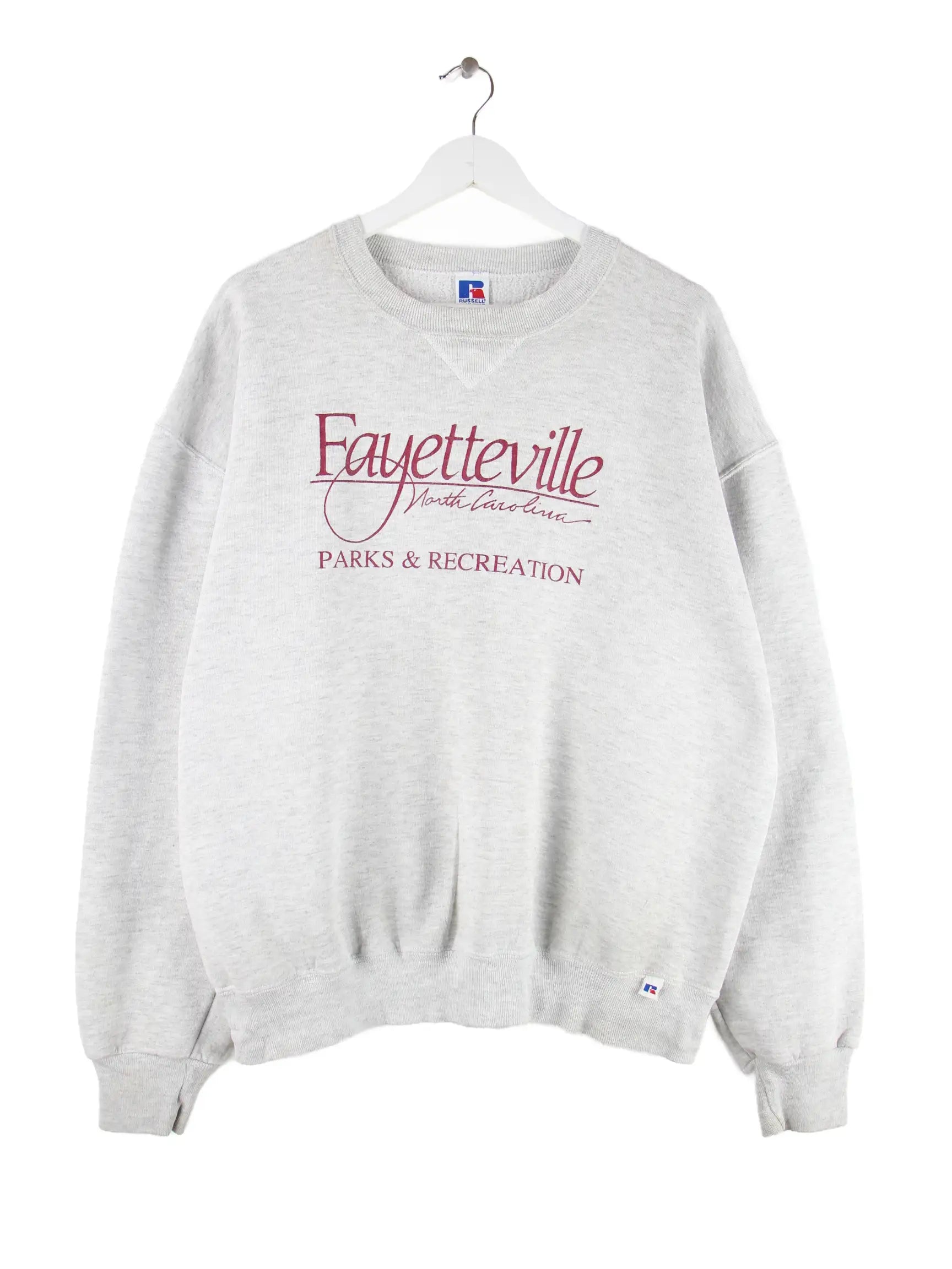 Grauer Sweater des Labels Russell Athletic aus den 90'ern in Größe XL. Er ist aus einer Baumwollmischung hergestellt und in gutem Zustand lieferbar. Mit schickem Vintage Print.