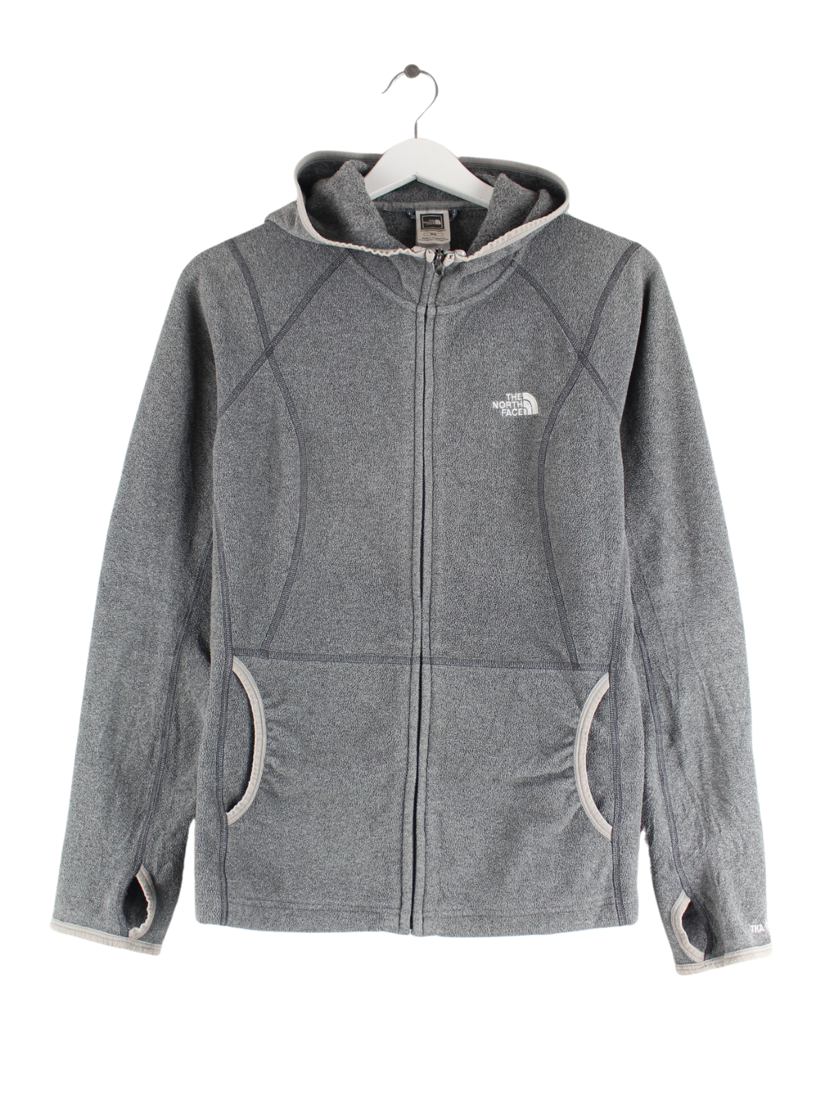 Hoodie des Labels The North Face mit langem Reißverschluß in Größe M. Er ist aus weichem Fleece angefertigt und in Grau in Stock.