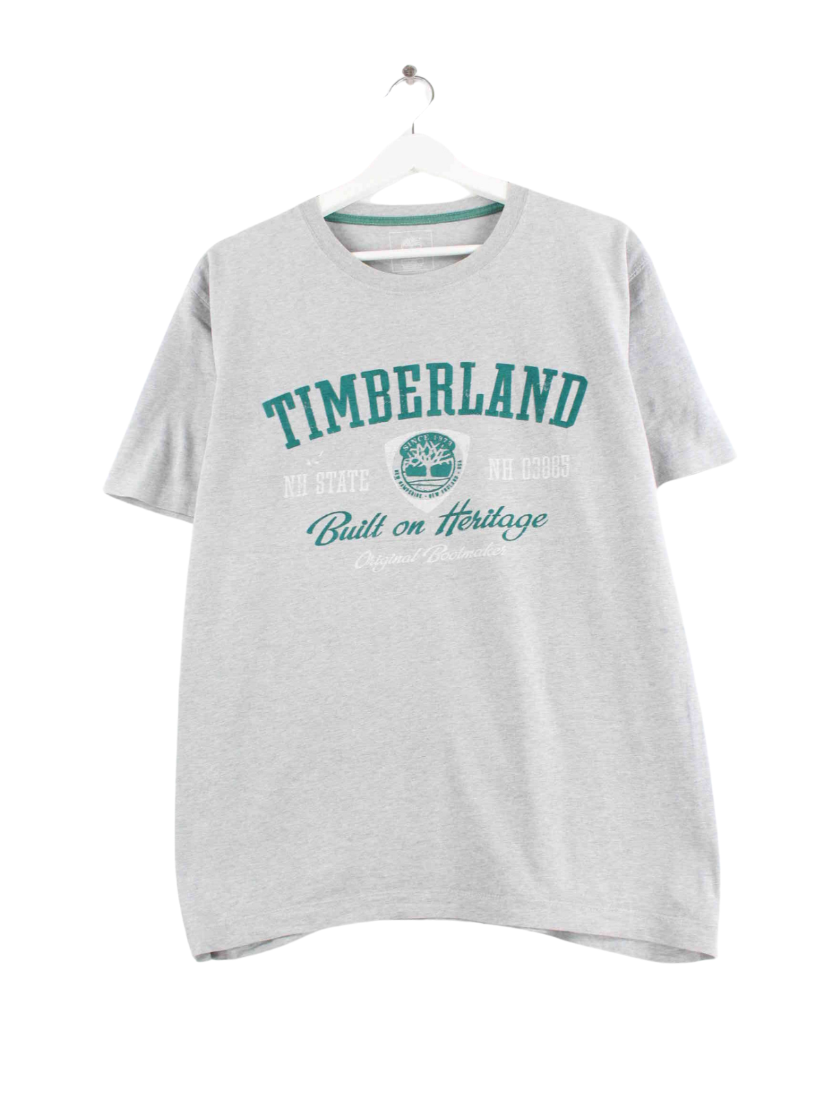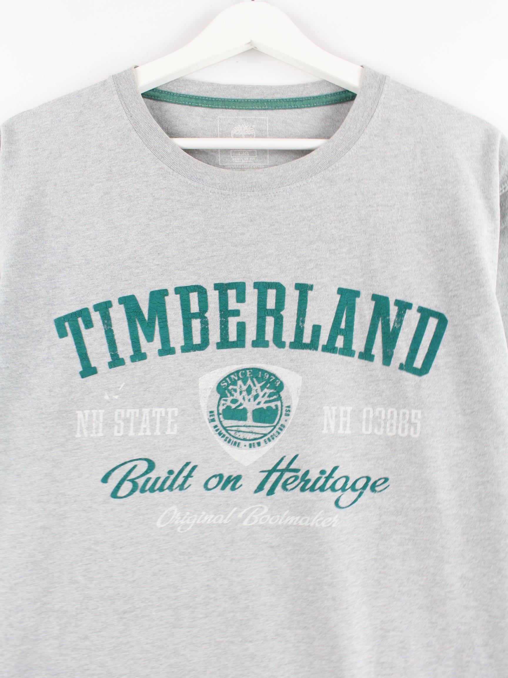 Graues T-Shirt der Marke Timberland in Größe L. Es ist aus Baumwolle und in gutem Zustand on Stock.