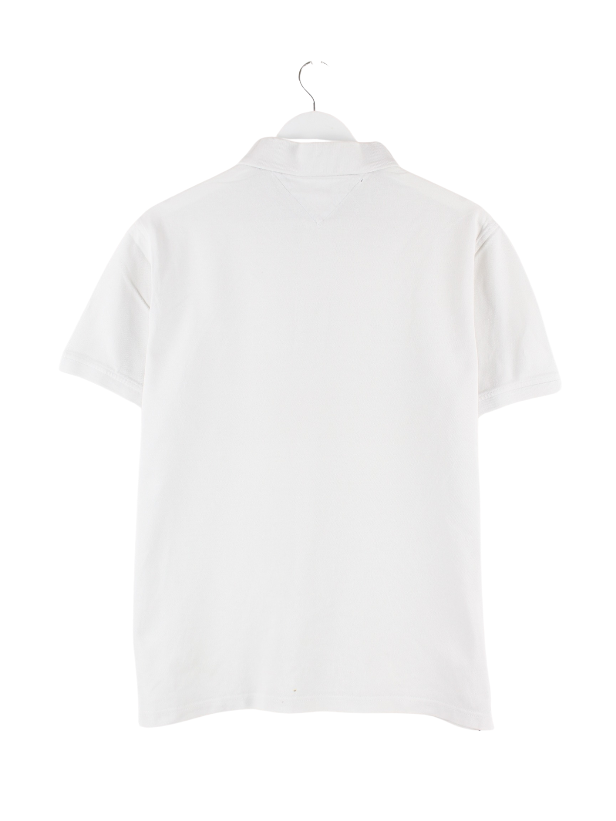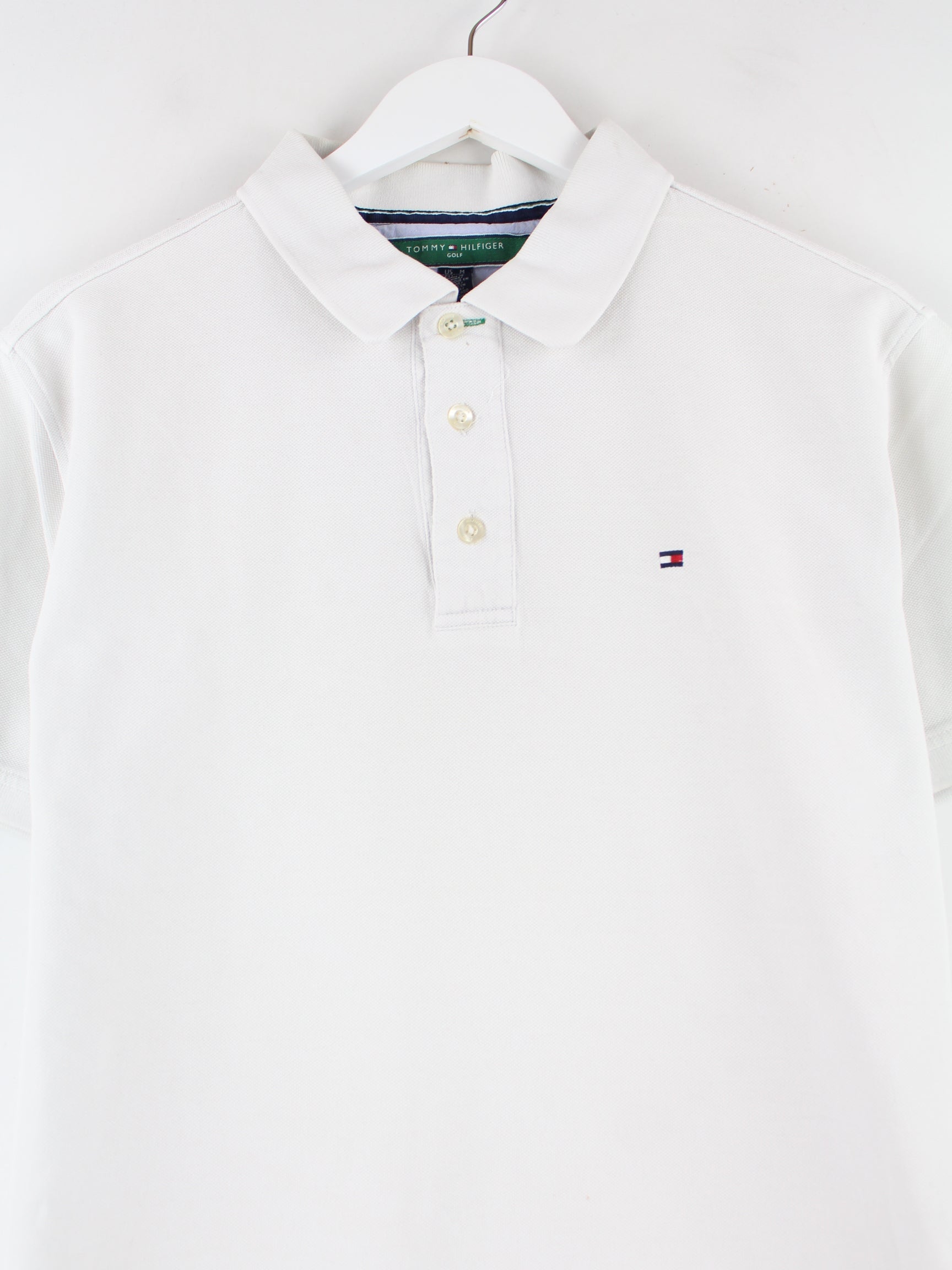 Weißes Poloshirt vom Label Tommy Hilfiger in Größe M. Es ist aus Baumwolle gemacht und in gutem Zustand vorrätig.