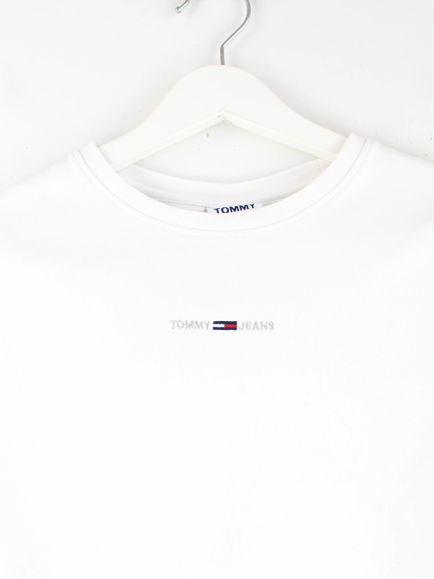 Weißes T-Shirt mit gesticktem Logo der Marke Tommy Hilfiger in Größe S. Es ist aus Baumwolle und in sehr gutem Zustand lieferbar.