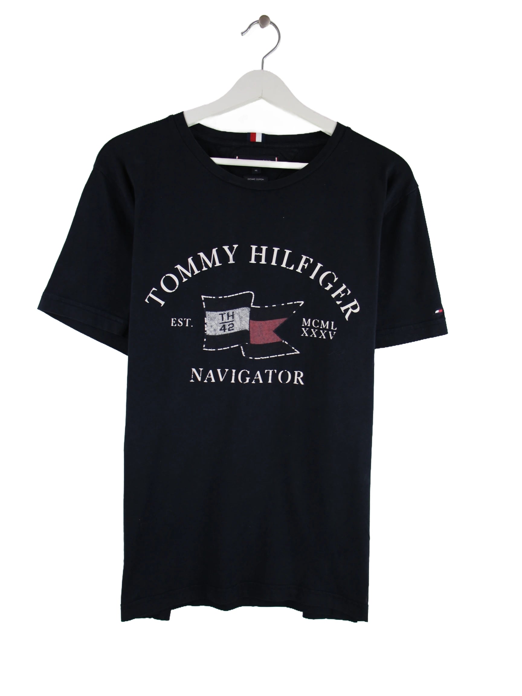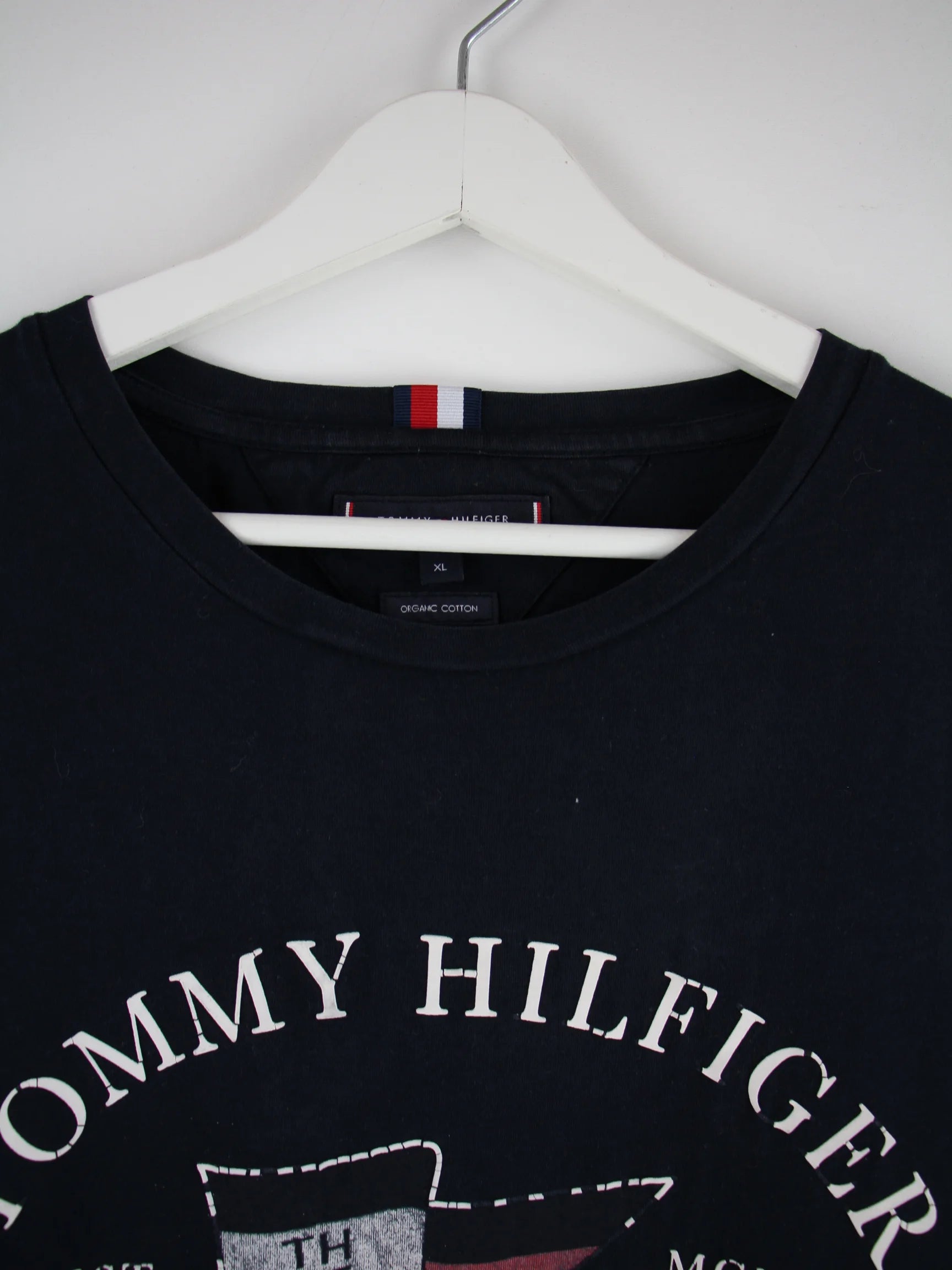 Schwarzes T-Shirt der Brand Tommy Hilfiger in Größe XL. Es ist aus Baumwolle gefertigt und in gutem Zustand vorrätig. Mit chiquem Print.