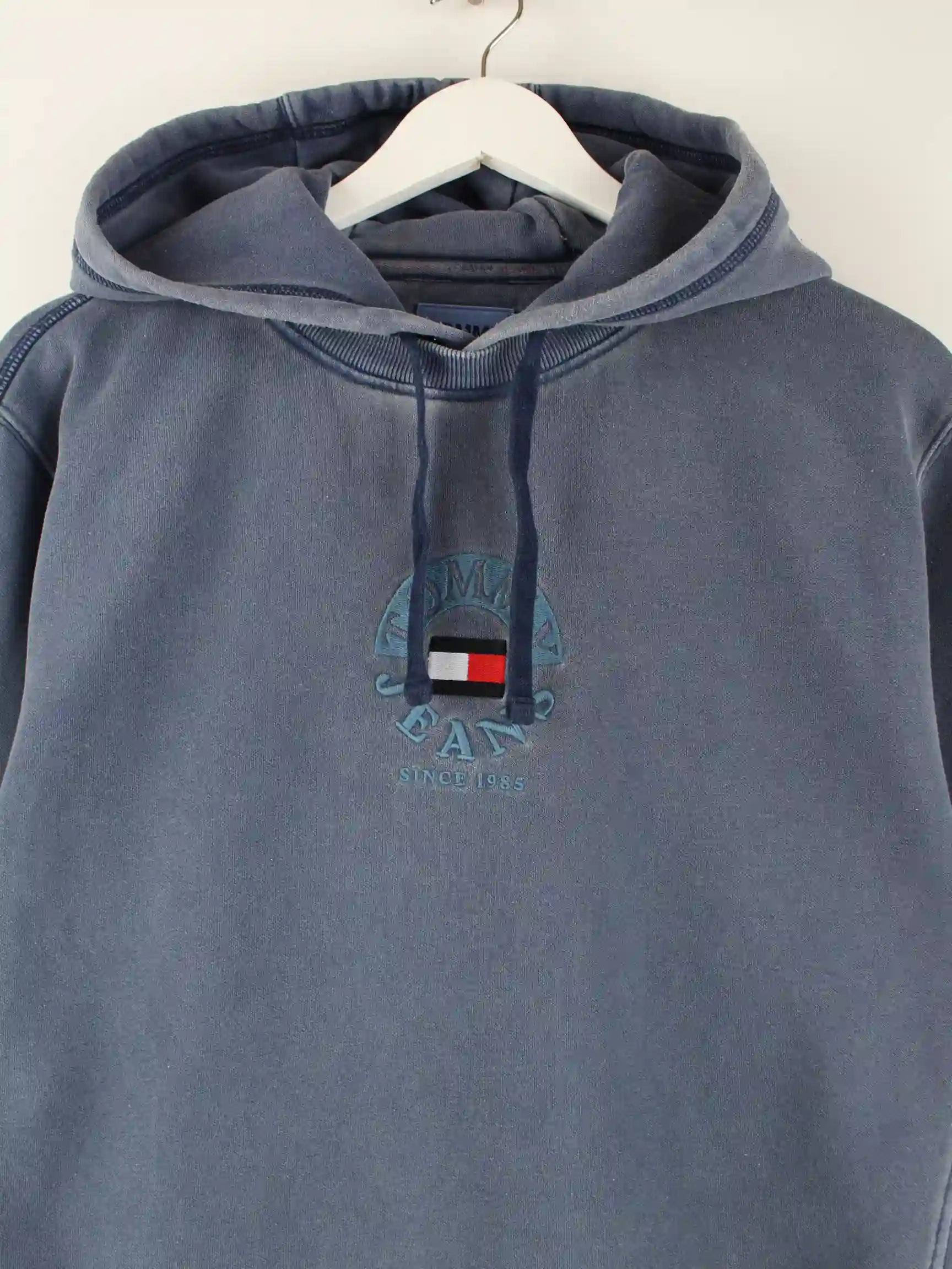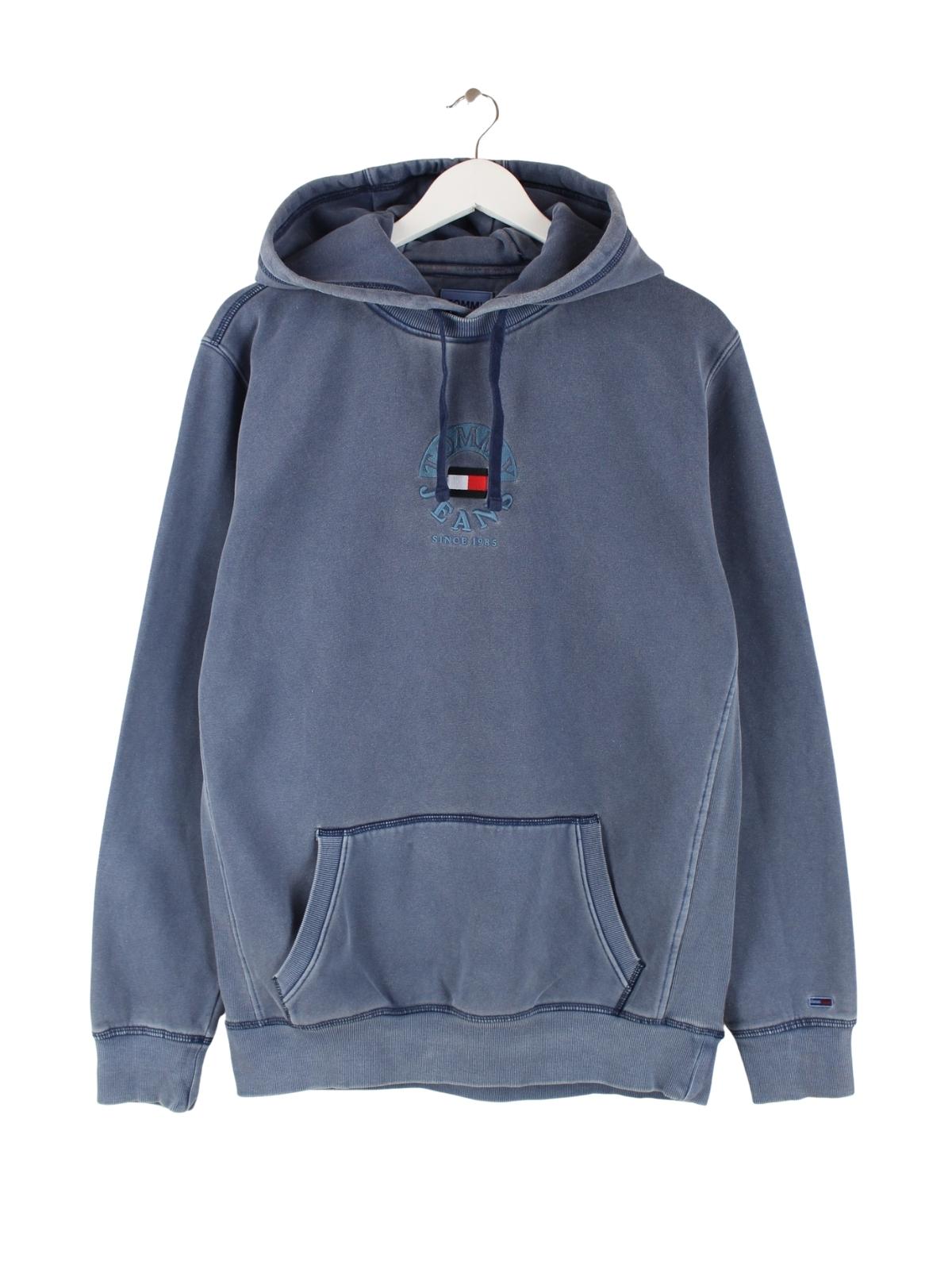 Stone Washed Hoodie der Brand Tommy Hilfiger in Größe M. Er ist aus einer Baumwollmischung gefertigt und in Blau auf Lager.