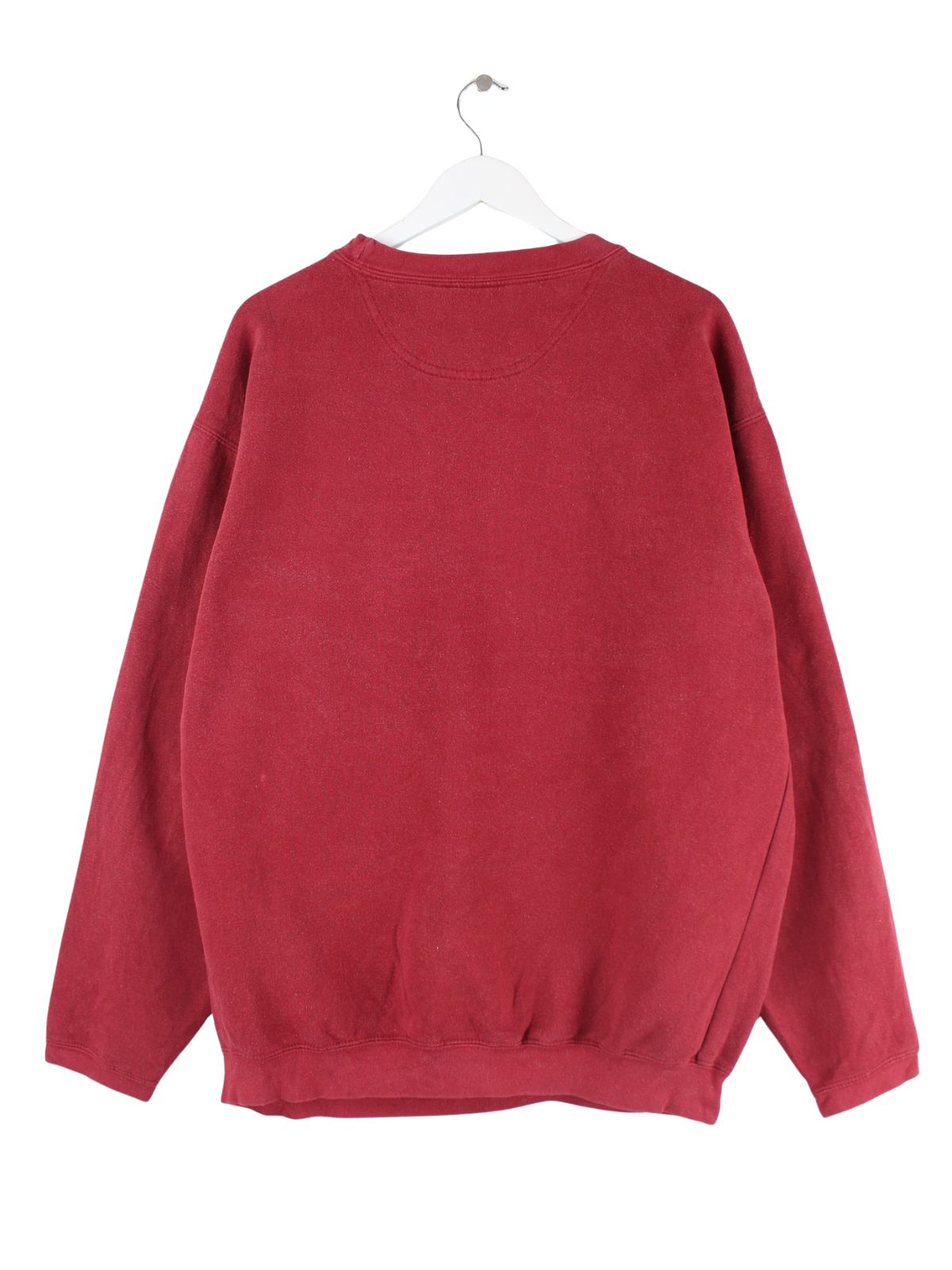 Roter Vintage Sweater mit gestickten Motiven in Größe L. Er ist aus einer Baumwollmischung hergestellt und in gutem Zustand zu haben.