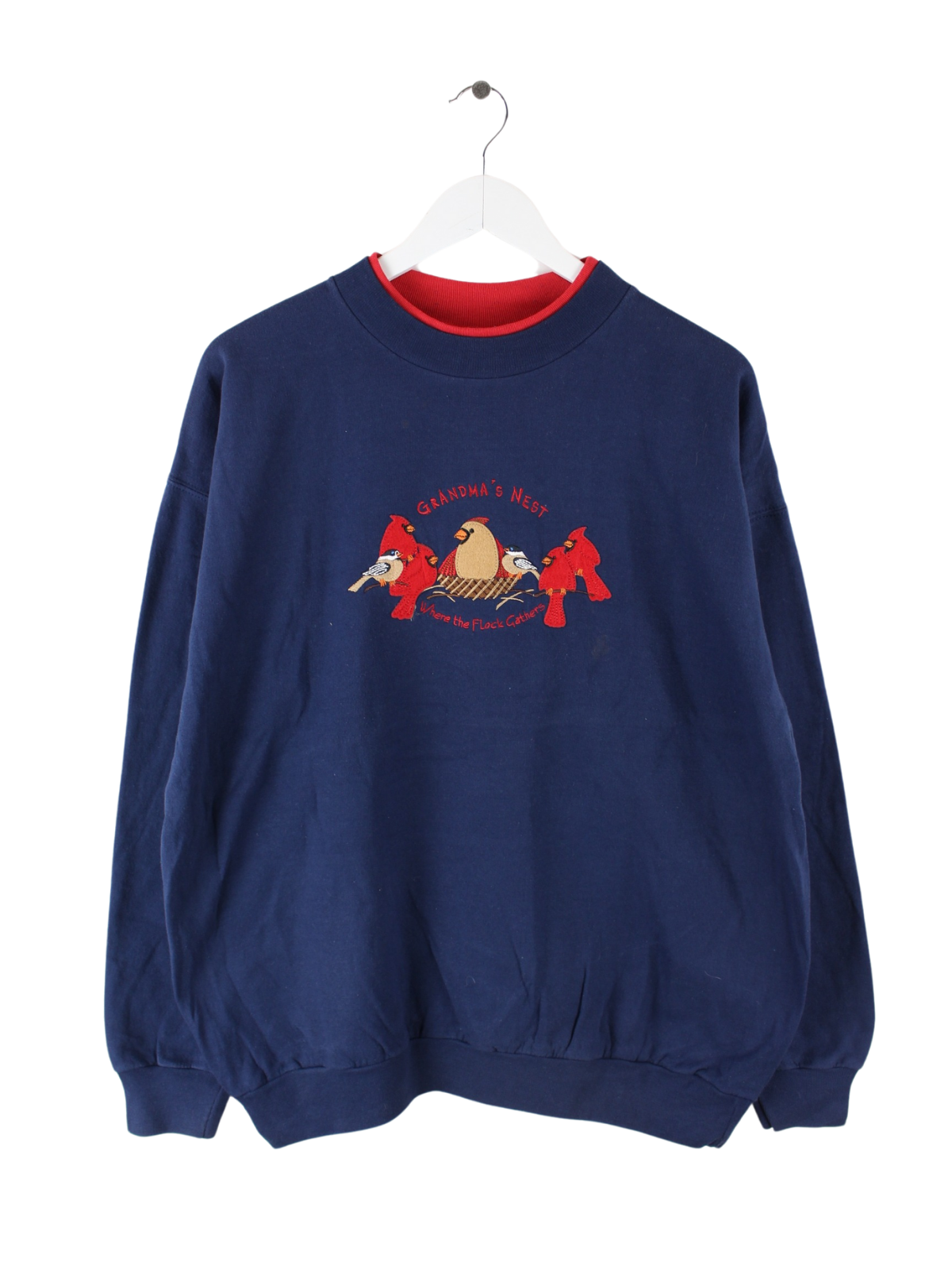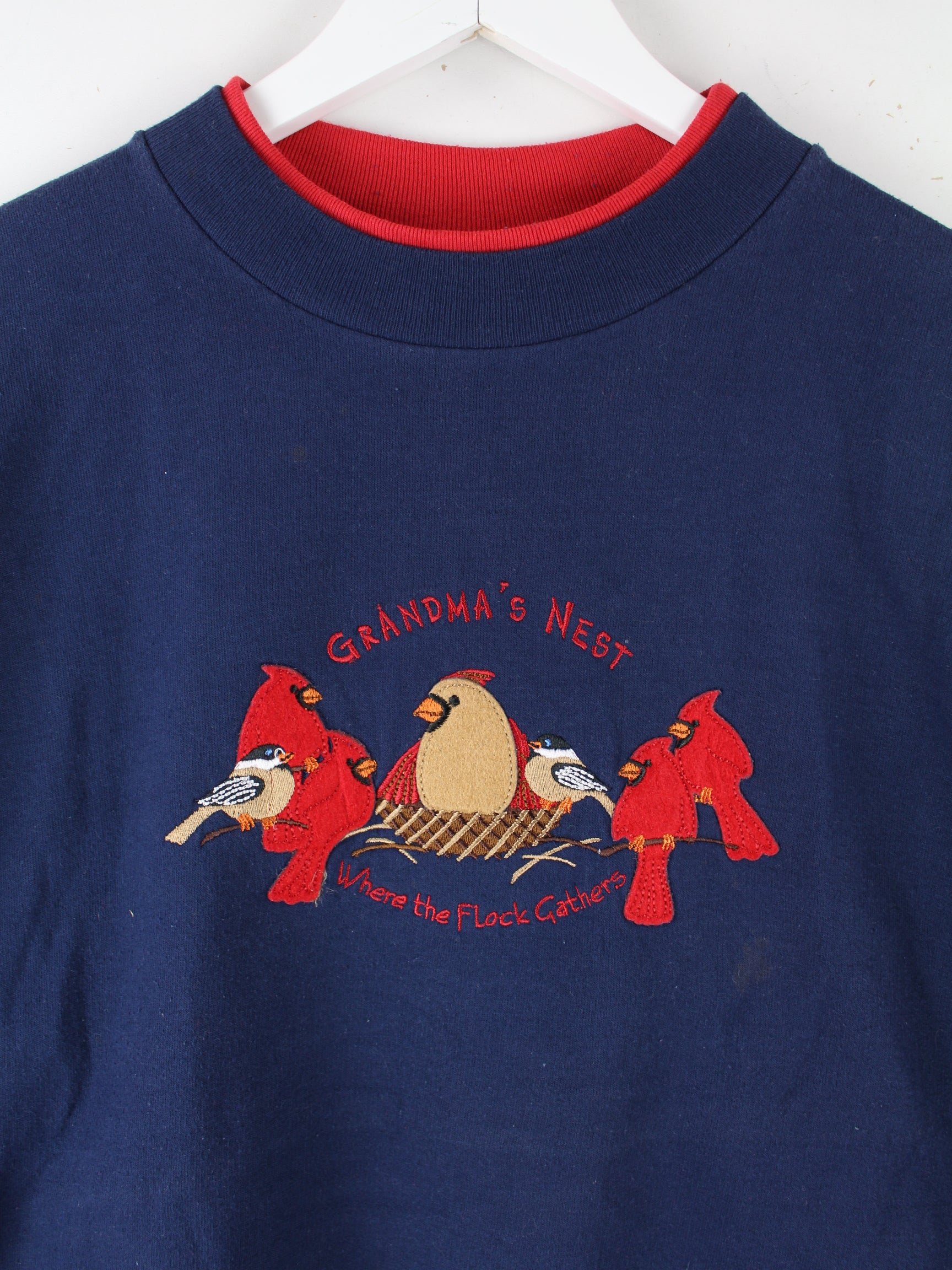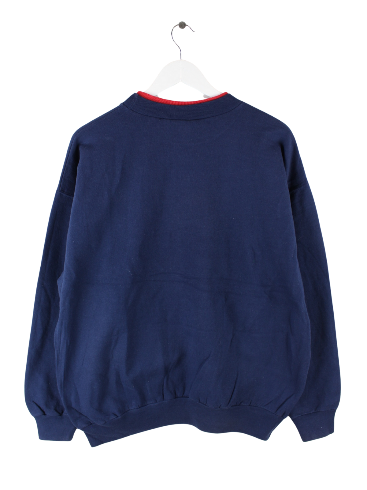 Blauer Vintage Sweater mit Stick aus den 90'ern in Größe L. Er ist aus einer Baumwollmischung und in gutem Zustand lieferbar.