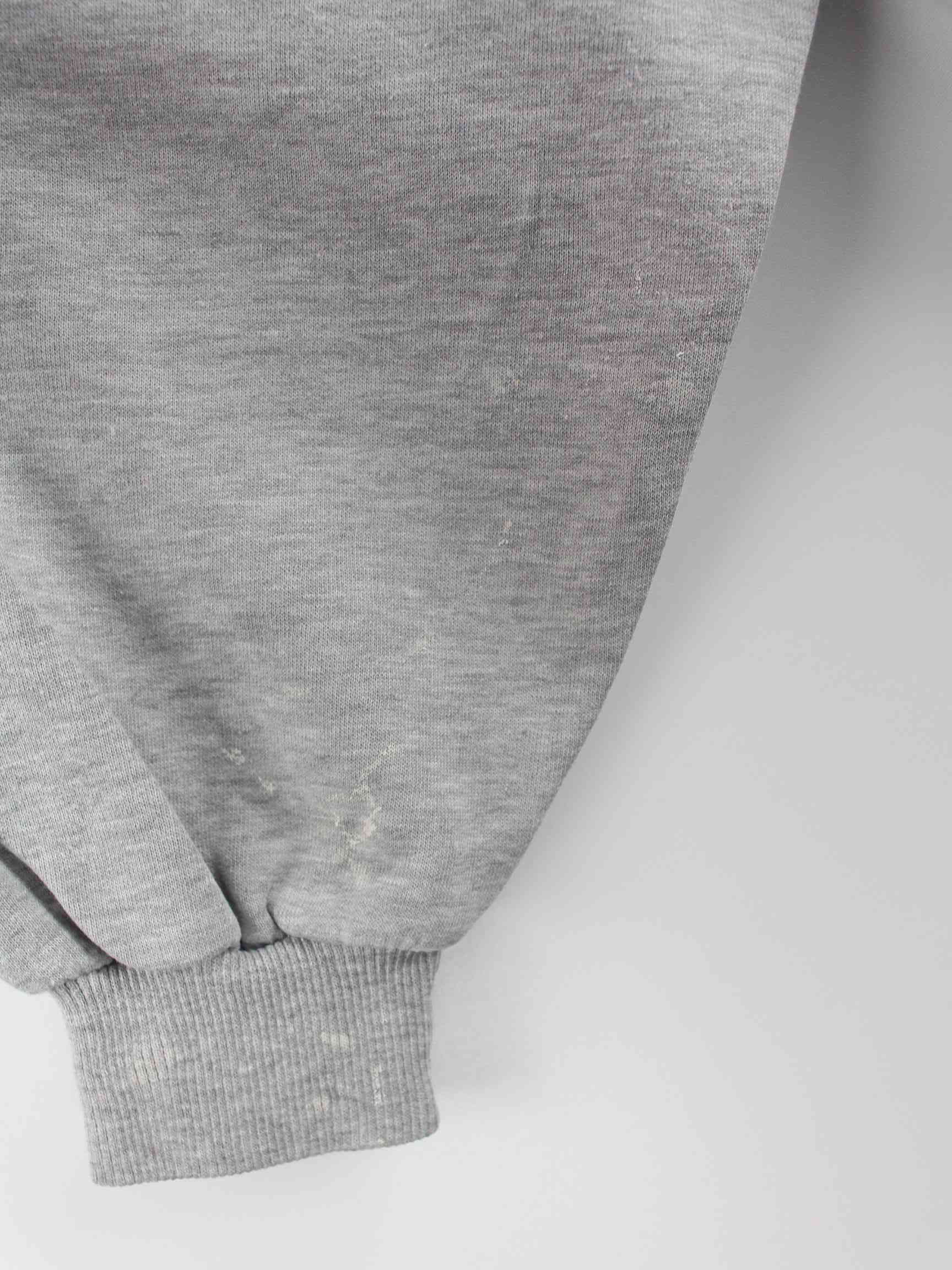 Grauer Vintage Sweater mit Stick und kurzem Reißverschluß aus den 90'ern in Größe L. Er ist aus einer Baumwollmischung hergestellt und in gutem Zustand zu haben.
