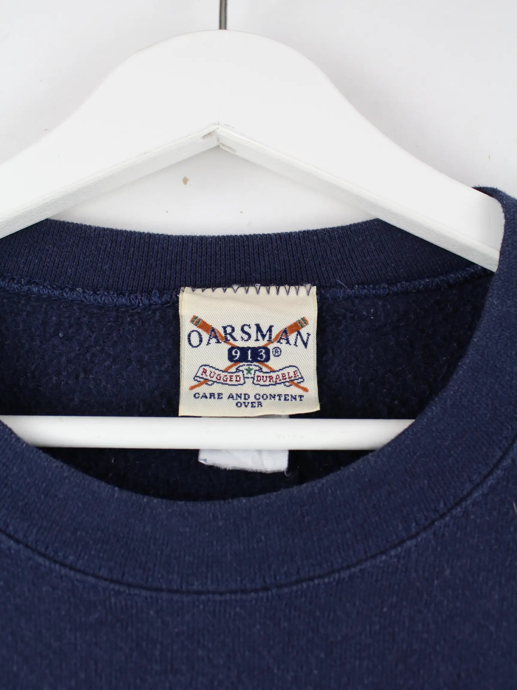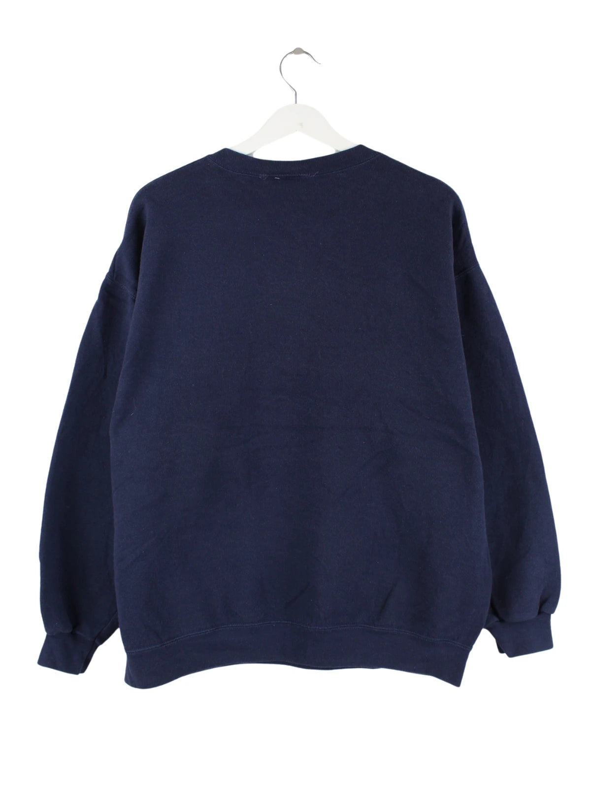 Blauer Vintage Sweater mit gesticktem Logo aus den 90'ern in Größe L. Er ist aus einer Baumwollmischung angefertigt und in sehr gutem Zustand bei uns vorrätig.