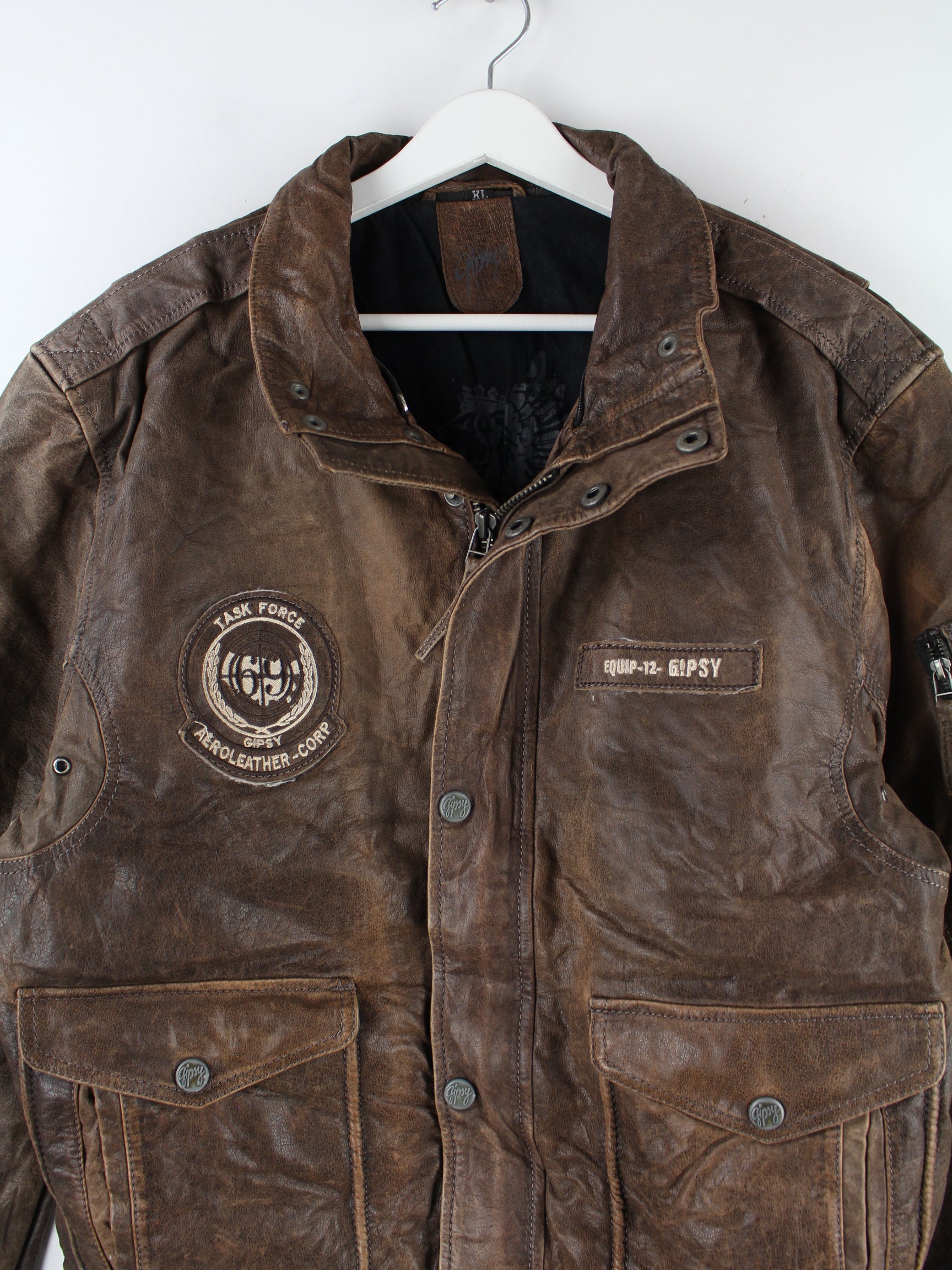 Braune Vintage Jacke aus den 90'ern in Größe XL. Sie ist aus Leder gefertigt und in gutem Zustand bei uns vorrätig.